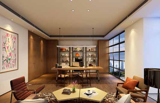 由上圖可以看出設計師想要表現它們的一種古代美,融合了莊重和優雅的雙重氣質,這個董事長辦公室裝修裝飾的天花造型就采用了此類方法,表現民族特色的文化,大量地使用木材來完成這個辦公室裝修裝飾項目,展示企業的恢宏大氣的形象。
