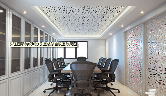就是新的元素和中式的元素的巧妙地結合,采用了沉穩的裝修路線,還有雕刻的天花造型和高隔斷等等。這是該紡織城辦公室裝修的案例中它的會議區的裝修,以此來表現企業的高大的形象,這很精致。