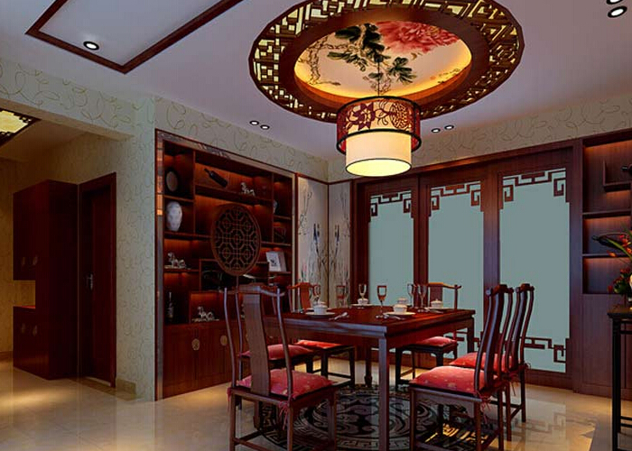 朱紅色的餐桌椅,配上精致的燈飾,使整個(gè)空間硬朗而又華麗、優(yōu)雅。餐廳的裝修又是木質(zhì)鏤空隔斷,大氣經(jīng)典。墻面的壁紙與吊燈都顯示出一種富麗堂皇的感覺(jué)。